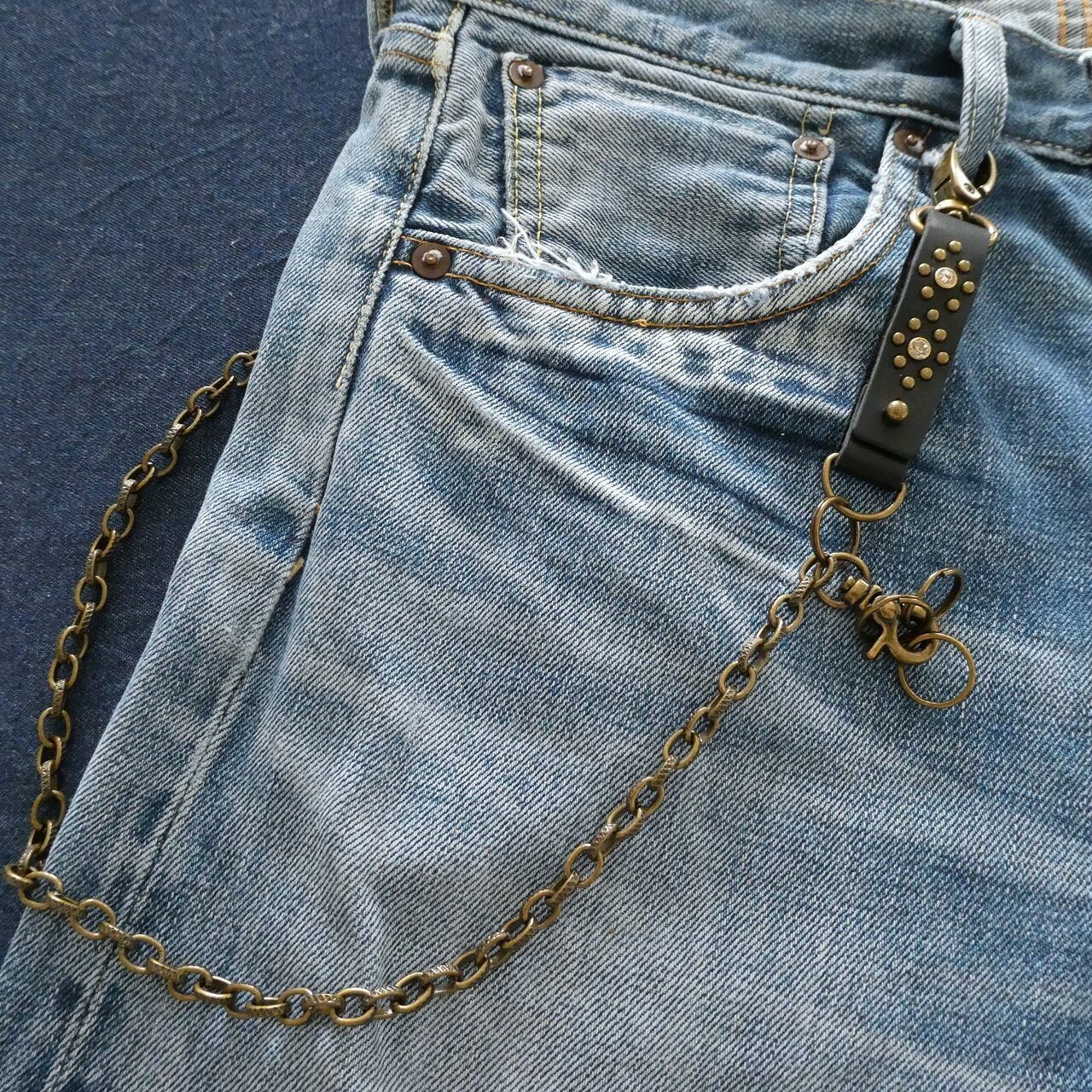 大振りで重厚になり過ぎないやや小ぶりな幅の主張し過ぎないデザインかつ、よく見ると模様が入った小豆チェーンとなっていますので、ウォレットチェーンとしてだけではなく単品で腰回りのアクセサリーとしてもさり気なく扱えるアイテムです。