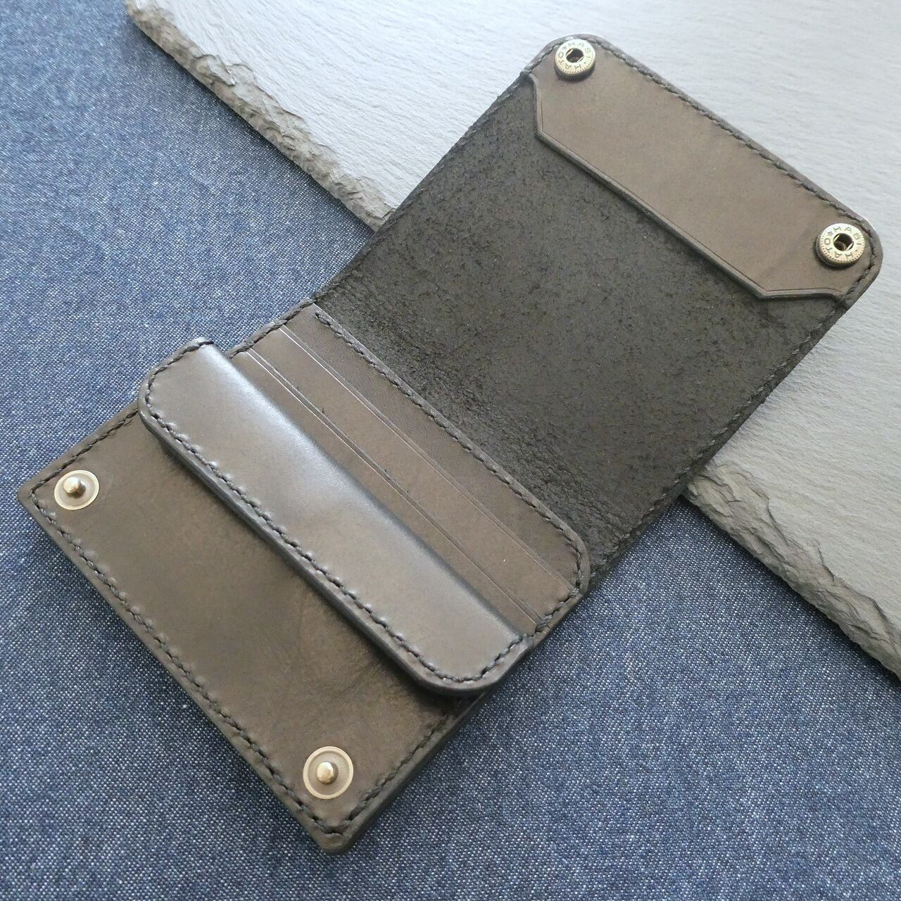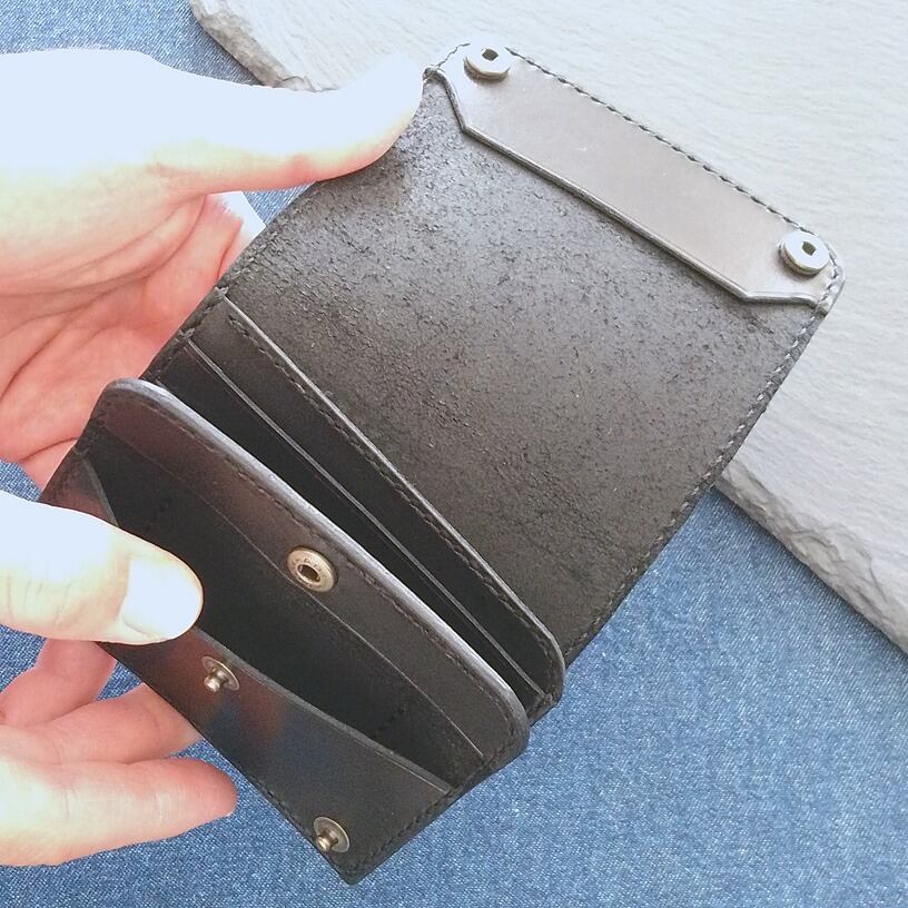 カードポケットは革が馴染めば免許証等の厚手のカードで各2枚ずつ収納出来ます。小銭入れはトラッカーウォレット等で見かける縫い方で縫い付けてありますので、手前に引き出すことでマチ無しながらも見やすい工夫をしております。