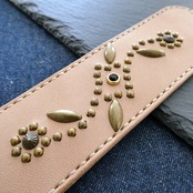 有名な皮革ブランド栃木レザーの牛ヌメ革を使用し、fホールとフラワーモチーフのデザインを合わせた、flowerホールのスタッズを取り付けたデザインのブレスレット:バングルになります。